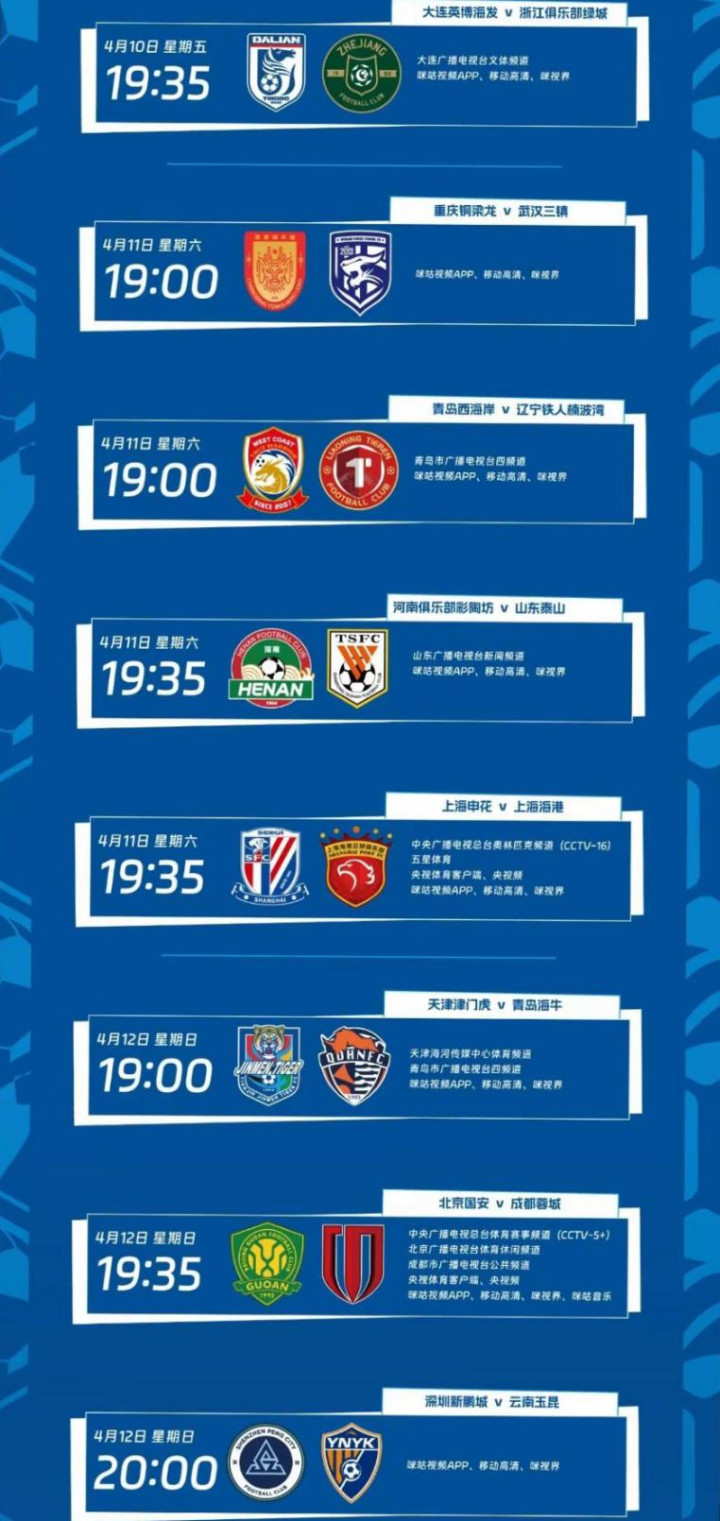 而在4月12日晚7点35分,由国安在主场对阵蓉城,直播平台包括CCTV5+频道。国安今年被扣了5分,4轮过后仅取得1胜1平2负,还是负分。蓉城0分开局,3胜1平后领跑,这是蓉城升入中超以来夺冠希望最大的一个赛季,本轮客战强敌,蓉城将面临考验。