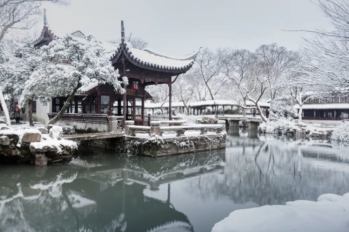 江苏苏州拙政园雪景。