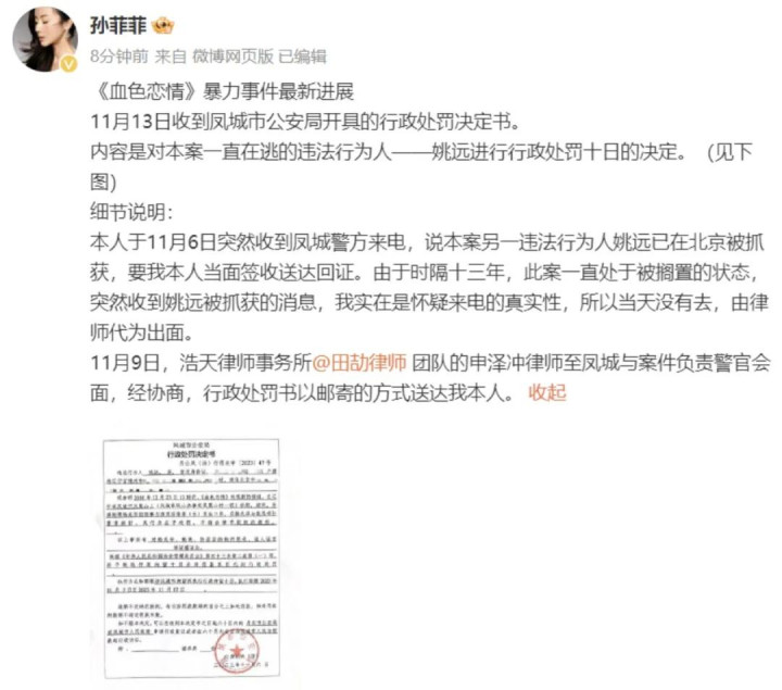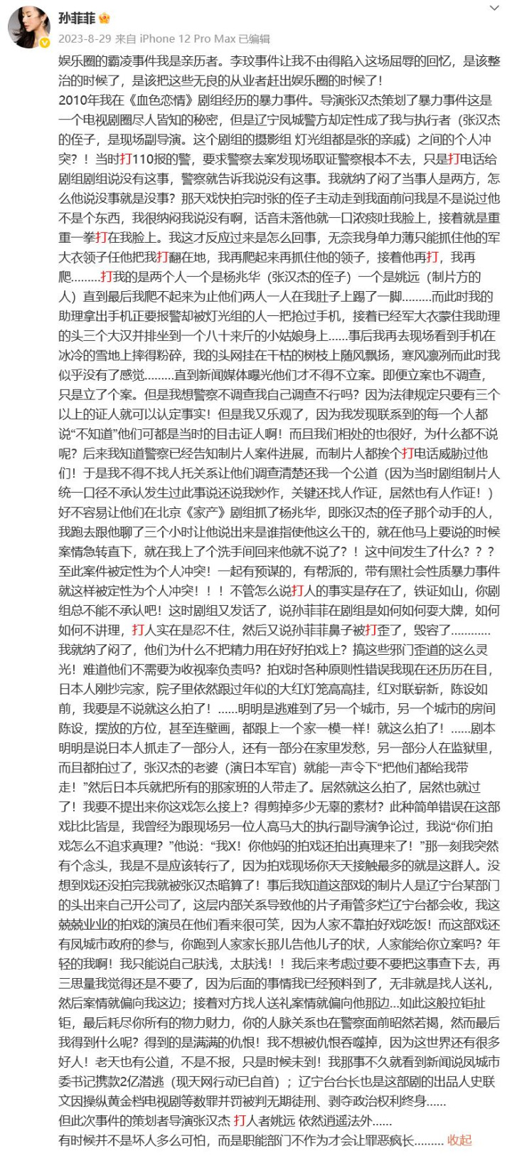 曾公开揭露了影视行业的乱象,孙菲菲详细回应了自己在2010年拍摄电视剧《血色恋情》时遭遇到了暴力事件。
