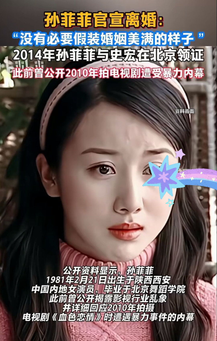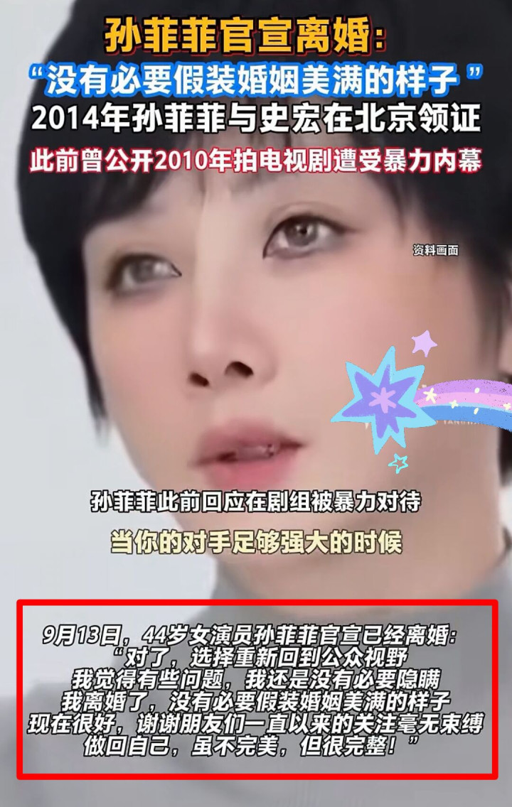 9月13日,44岁女演员孙菲菲直接在社交平台上官宣离婚消息,一句“没有必要假装婚姻美满的样子”,可谓把孙菲菲的真情性子展露得淋漓尽致。